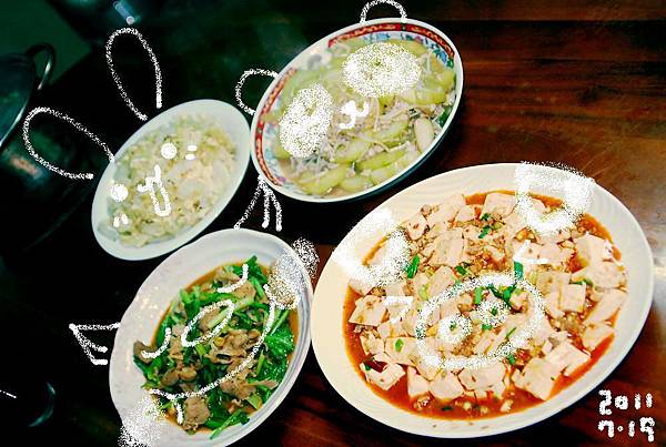 今天早上拿水的時候有瞧過冰箱裡的食材,也因此老媽才會交代我煮晚餐而不是買便當,腦袋裡盤算著晚餐的菜單,於是在下大雨的時候,我去了一趟農會超市買足了食材,本日賴小甜菜單:小兔子洋蔥炒蛋、馬卡獸五花肉炒油菜、熊貓胡瓜燴金針菇、豬豬麻婆豆腐、薑絲文蛤湯。